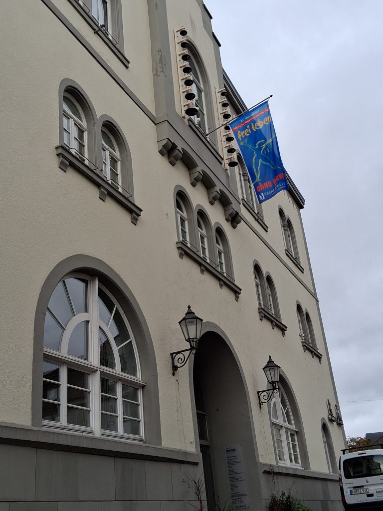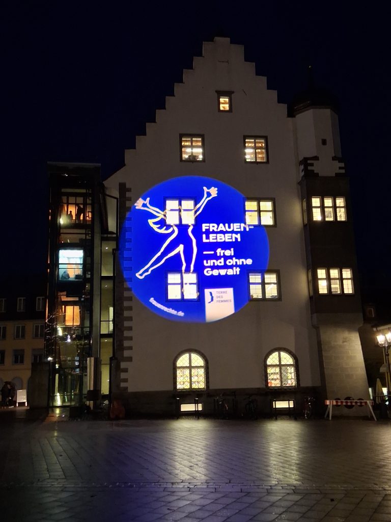 Teilnahme an der weltweiten UNO-Aktion „Orange your City“ gegen Gewalt an Frauen: die Stadtbibliothek Radolfzell wurde orange angestrahlt, mit einer Projektion eines erklärenden Emblems.