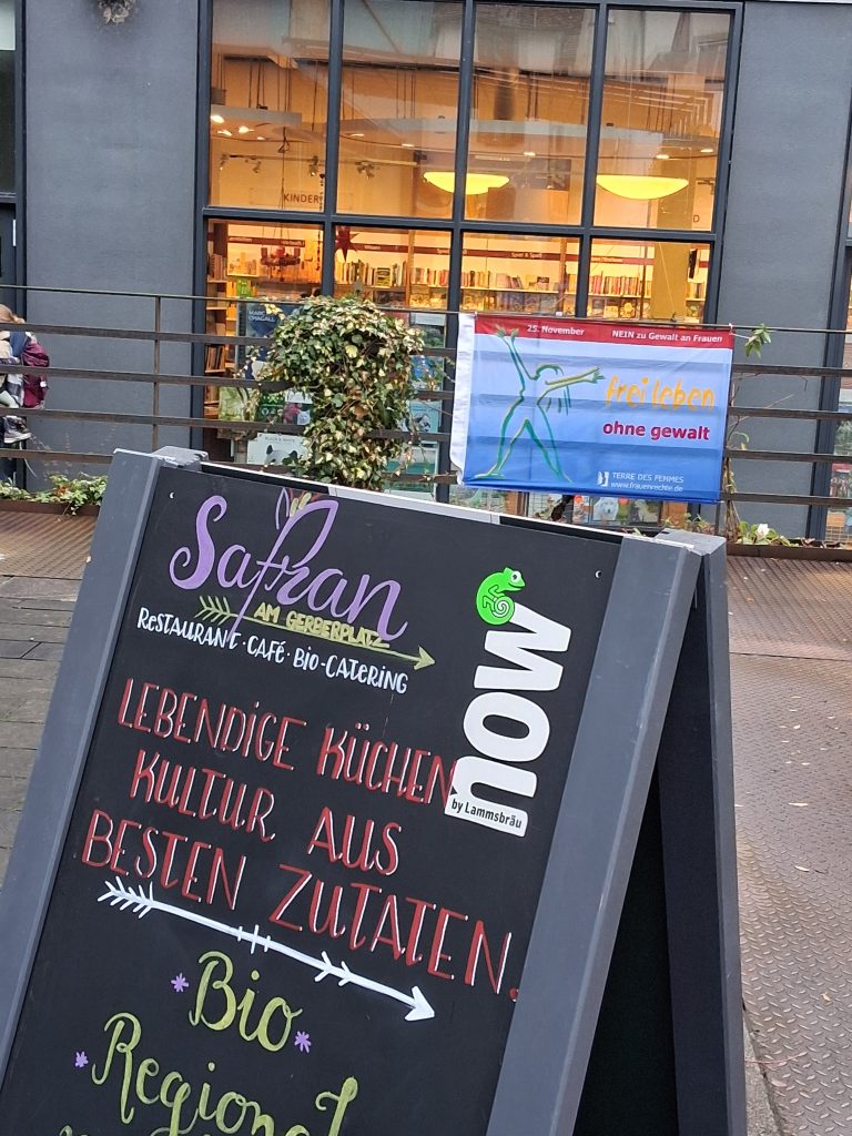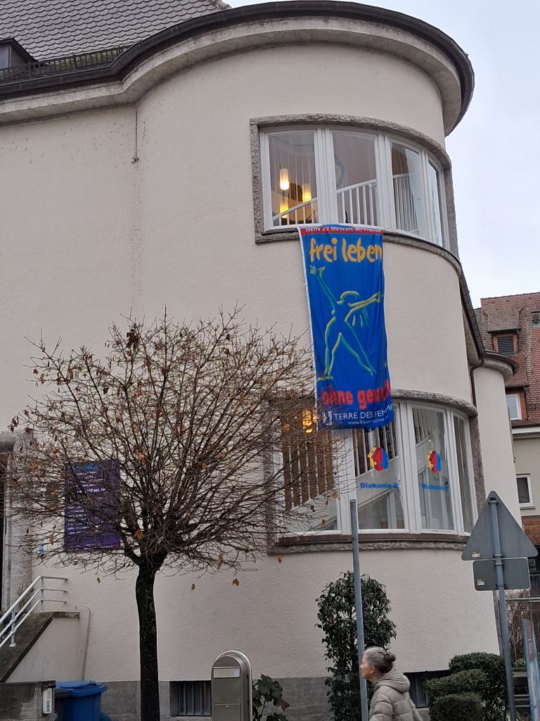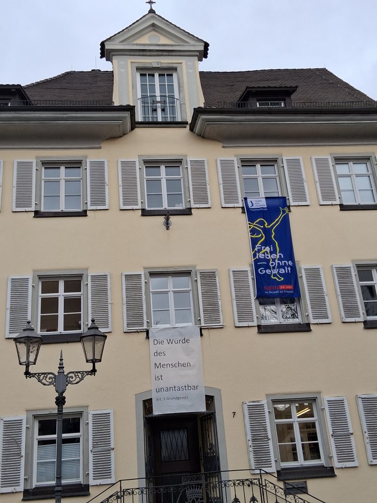 TERRE-DES-FEMMES-Fahnen „ Frei leben – ohne Gewalt“ an der Diakonie in der Teggingerstraße, am BioBistro „Safran“ (Gerberplatz), am kath. Pfarrhaus am Marktplatz, am Radolfzeller Rathaus, an der Beratungsstelle Sozialdienst kath. Frauen in der Löwengasse, an der kath. Meinradskirche, am ev. Kindergarten an der Christuskirche.